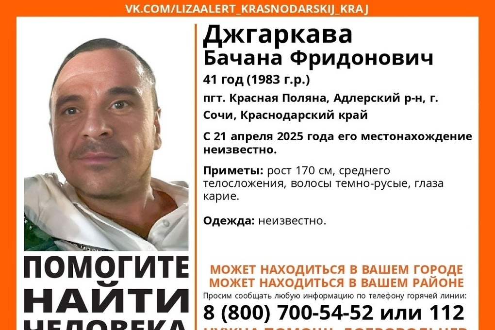 В Сочи разыскивают 41-летнего Бачану Джгаркава. По информации поискового отряда «ЛизаАлерт», его местонахождение неизвестно с 21 апреля. Он был посёлке городского типа Красная Поляна Адлерского района.