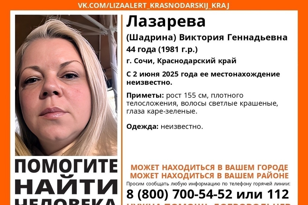 В Сочи пропала 44-летняя Виктория Лазарева (Шадрина). По информации поискового отряда «ЛизаАлерт», её местонахождение неизвестно со 2 июня.