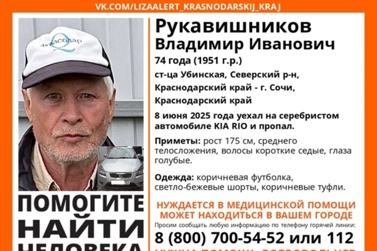 В Сочи разыскивают 74-летнего Владимира Рукавишникова. По информации поискового отряда «ЛизаАлерт», 8 июня он уехал на серебристого цвета Kia Rio и пропал. Он также был в станице Убинская Северского района Краснодарского края.