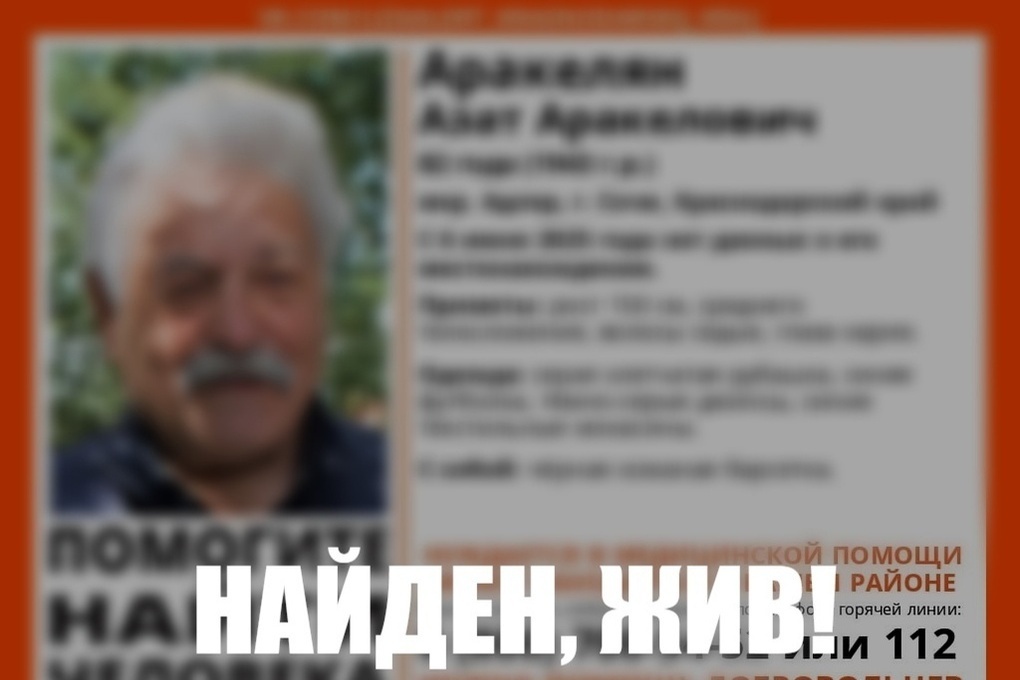 В Адлере Сочи пропал 82-летний Азат Аракелян. По сообщению поискового отряда «ЛизаАлерт», данных о его местонахождении нет с 6 июня.