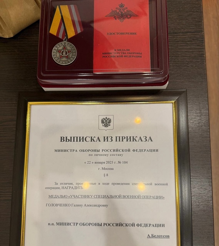Депутат Заксобрания Краснодарского края Галина Головченко 13 марта была награждена медалью «Участнику специальной военной операции». Об этом она сообщила в своём Telegram-канале, отметив, что Министерство обороны страны наградило её «за вклад в поддержку наших бойцов».