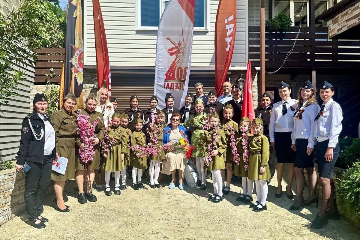 Так, во дворах домов участников и инвалидов ВОВ выступают сочинские коллективы. Артисты исполняют песни военных лет. А юнармейцы и школьники из патриотических отрядов проходят торжественным маршем перед окнами ветеранов.