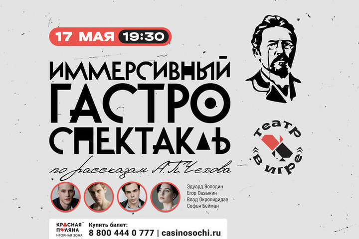 В игорной зоне «Красная Поляна» 17 мая на сцене театра «В игре» пройдет премьера иммерсивного гастроспектакля «Театральный бардак», основанного на произведениях А. П. Чехова. Здесь зрители станут частью постановки, взаимодействуя с актерами.