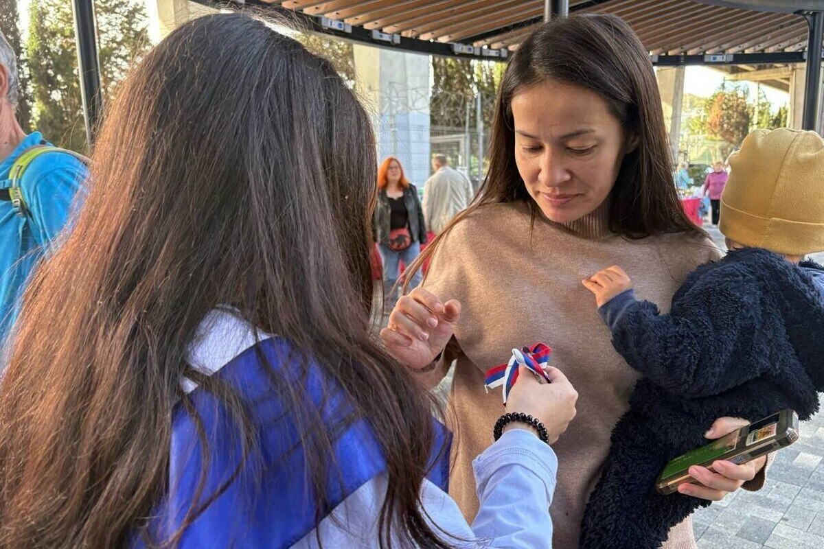 К акции присоединились юные горожане. Активисты Молодёжного совета в Хостинском районе раздают прохожим ленточки в цветах российского триколора. Также сочинцы наносят аквагрим в бело-сине-красных цветах на лица желающих.