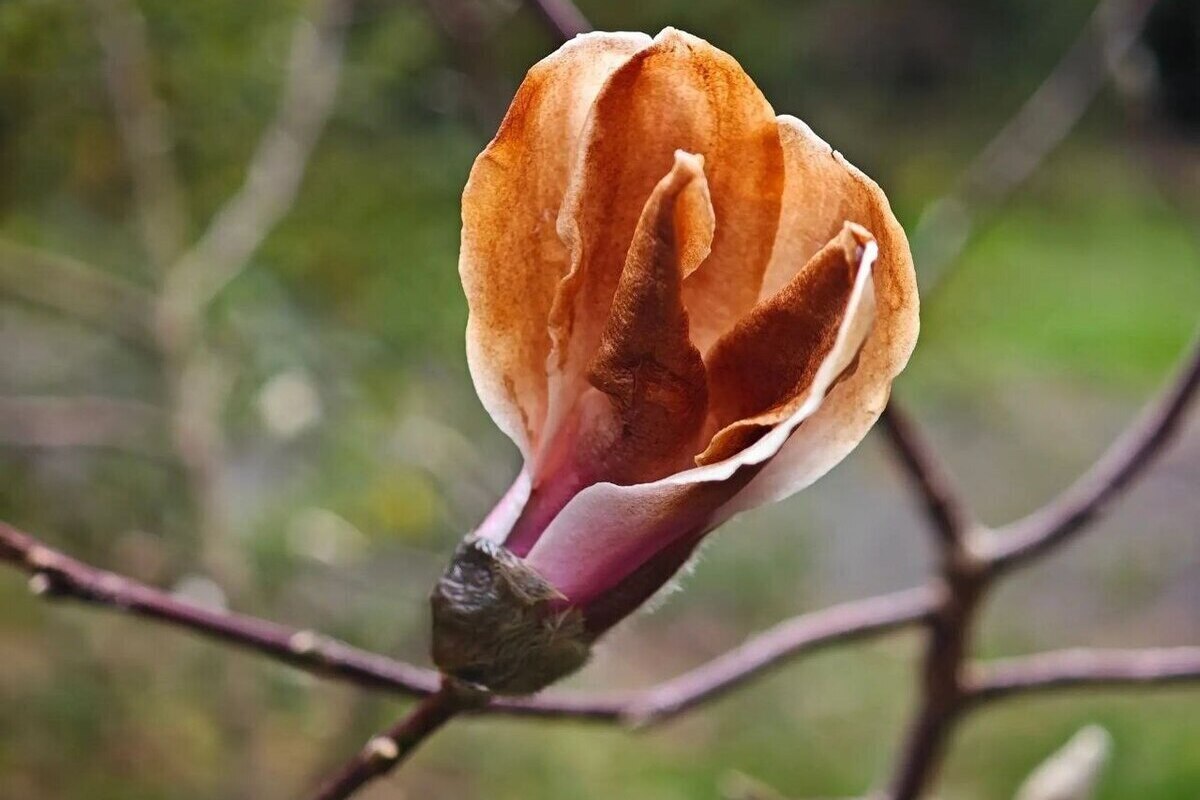 Специалисты-ботаники связывают нарушение цикла с теплой погодой, характерной для растений тропического происхождения. Однако последующие ночные заморозки повредили лепестки, из-за чего те приобрели нехарактерный для них бронзовый оттенок.