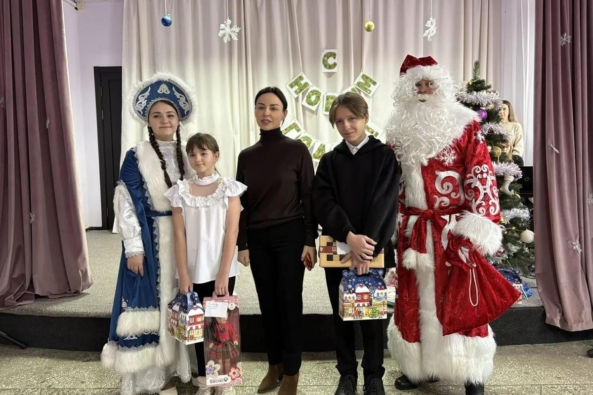 Депутат кубанского парламента Татьяна Очкаласова в рамках ежегодной акции партии " Единая Россия" "С Новым Годом , Дети" побывала на празднике в Нововладимировском сельском поселении Тбилисского района и вместе с Дедом Морозом и Снегурочкой поздравила детей, чьи отцы находятся в зоне СВО.